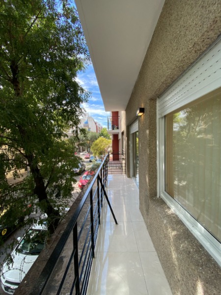 Dormitorio principal a la calle con pisos de porcelanato, placard a medida y baño en suite
