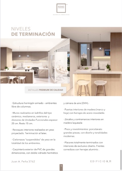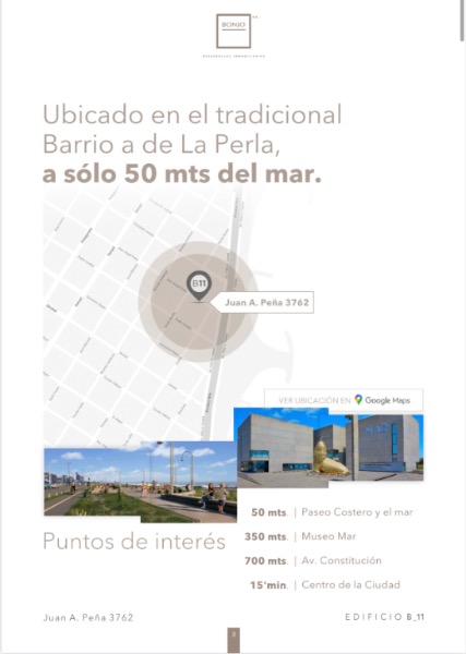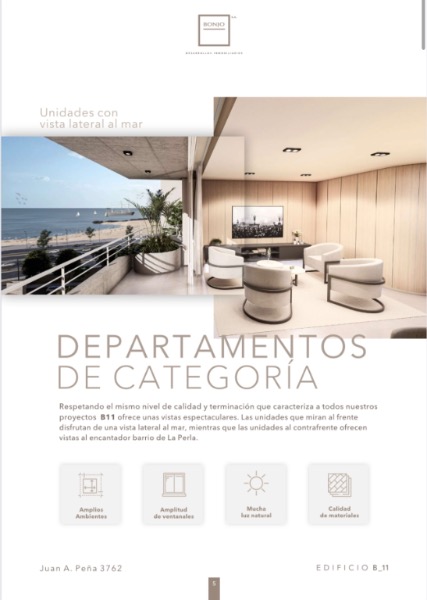 Bonjo 11 nos trae un nuevo concepto en Construcción. Logrando crear espacios con mucha estética, incorporando materiales de calidad, sumándose a la tendencia de lugares abiertos y en esta oportunidad con vistas espectaculares. Las unidades que miran al frente, disfrutan de de una vista lateral al mar, mientras que las unidades que miran al contrafrente ofrecen vistas al barrio La Perla.